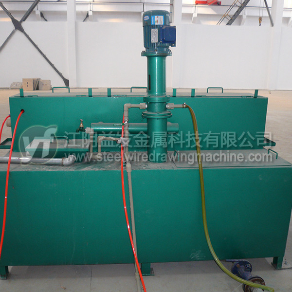箱體采用Q235板焊接而成,內膽采用314不銹鋼板焊接防止硼砂水受銹蝕的污染,保持硼砂的純潔度,保持鋼絲涂硼效果。兩層之間有40mm的保溫棉。不銹鋼電加熱管12KW,有熱電偶控制溫度,1.5KW的提升泵用于硼砂水上下循環,相當于自動攪拌,箱體上層液體采用了多次溢流方式,出口處高壓氣吹用于調節鋼絲表面的硼砂量。長度2500MM,寬度500mm,高度1100mm,重量800Kg。